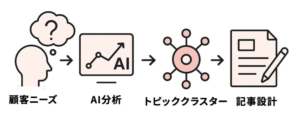 まず、顧客の潜在ニーズを把握し、長尾キーワード・質問型クエリ・解決策ベースのテーマを組み合わせます。