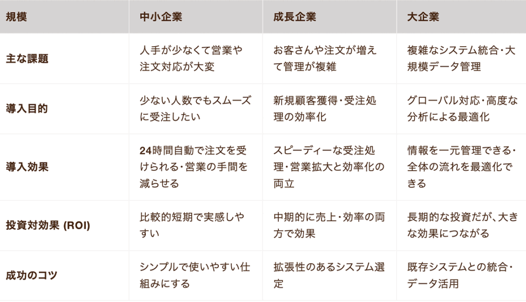 導入目的 | 少ない人数でもスムーズに受注したい | 新規顧客獲得・受注処理の効率化 | グローバル対応・高度な分析による最適化 |