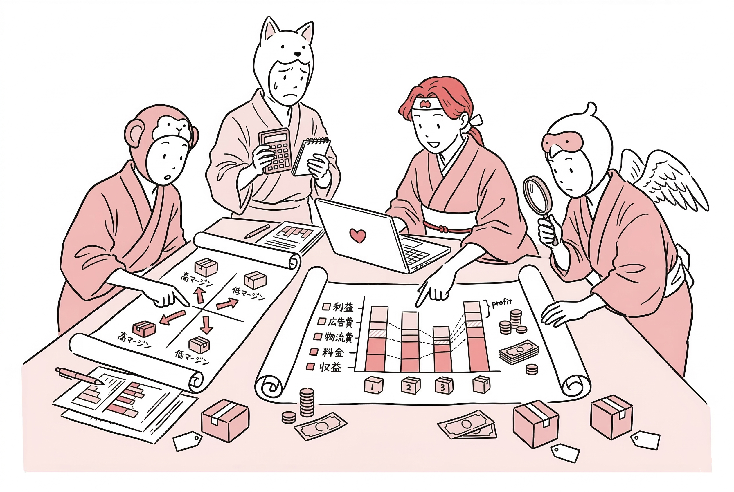 各商品の真の収益性を把握するため、売上から直接コスト、間接コスト、機会コストまで含めた損益計算を商品ごとに行います。モール手数料、決済手数料、配送料、梱包資材費、広告費配分、在庫保管料など、すべてのコストを商品単位で算出します。