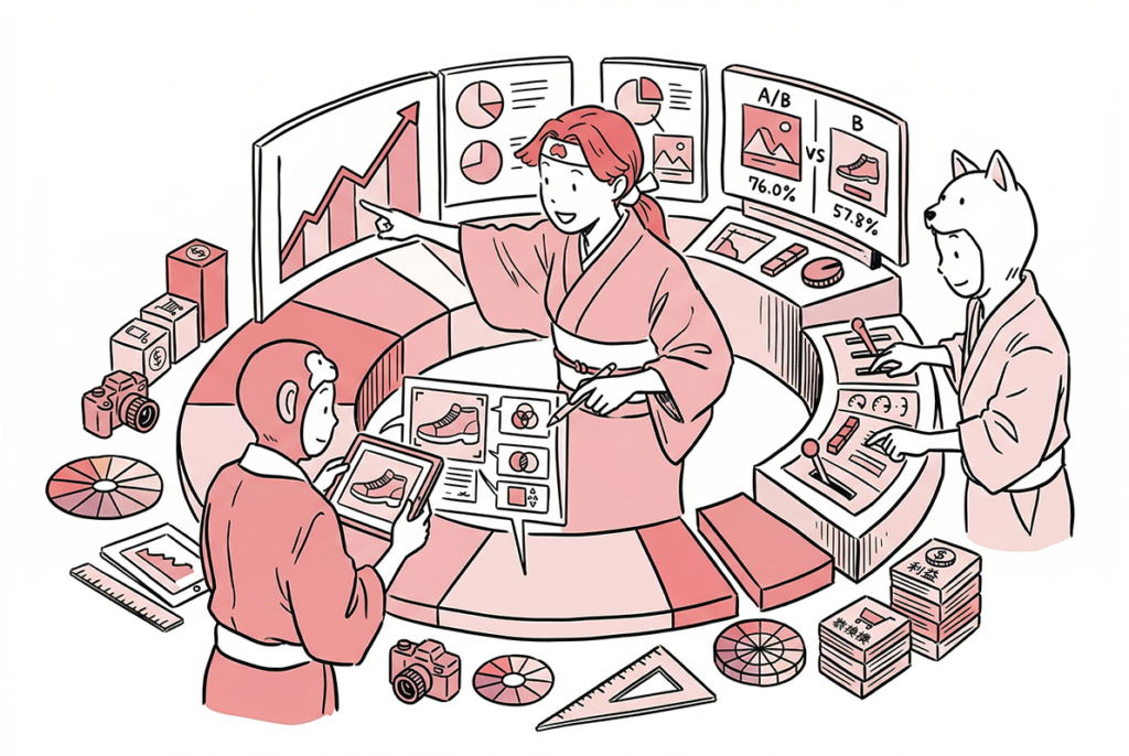 色彩、構図、商品の配置などの要素別に効果を測定し、成功パターンを体系化することで、新商品の画像制作にも活用できます。